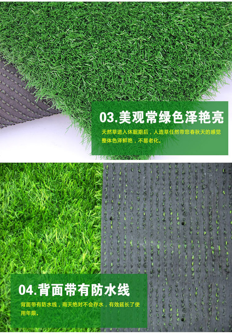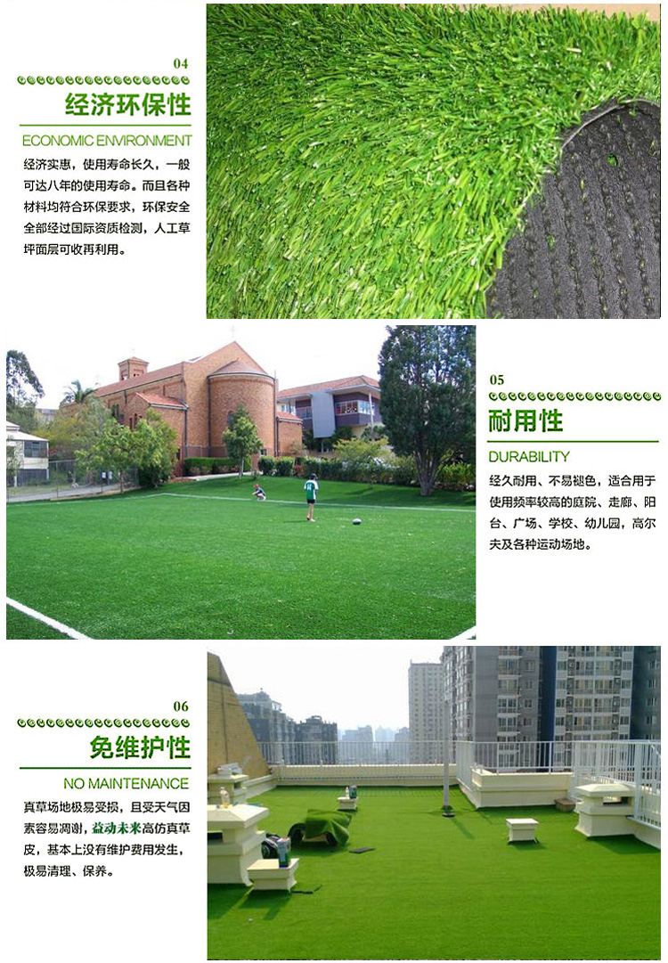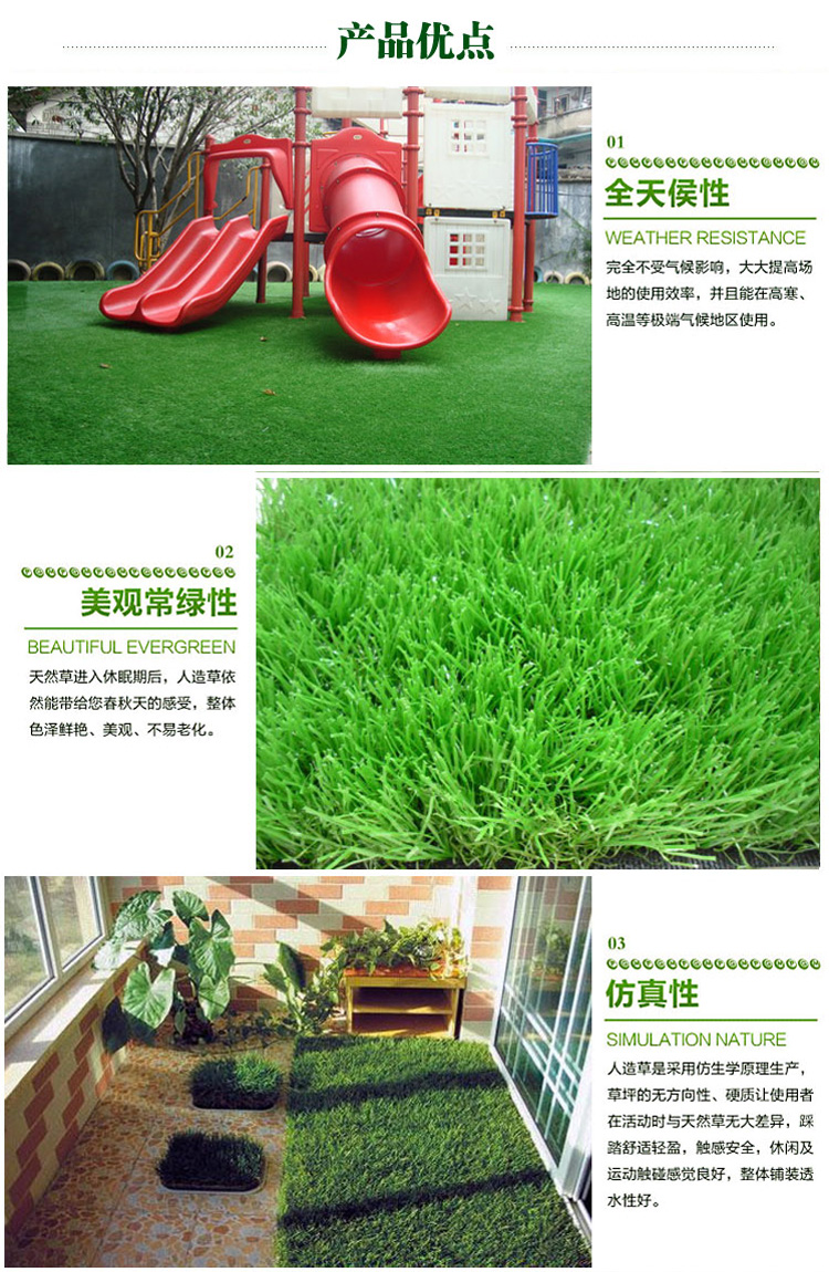 人造草坪,單純從照片上很難看出哪個質量好,但是價格到底差在什么地方呢?圍擋人造草坪的草絲沒有加抗老化的成分、所以容易褪色風化,另外它是用2m寬的小機器編織的、工人手工涂膠,制造成本低、而且這種生產工藝會讓草坪不耐磨、容易脫落;幼兒園專用人造草坪多是用4m進口大機器編織的,遇到這樣的產品怎么分辨呢?