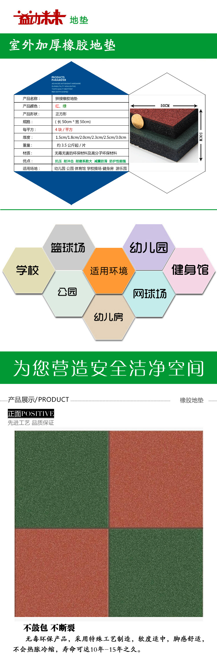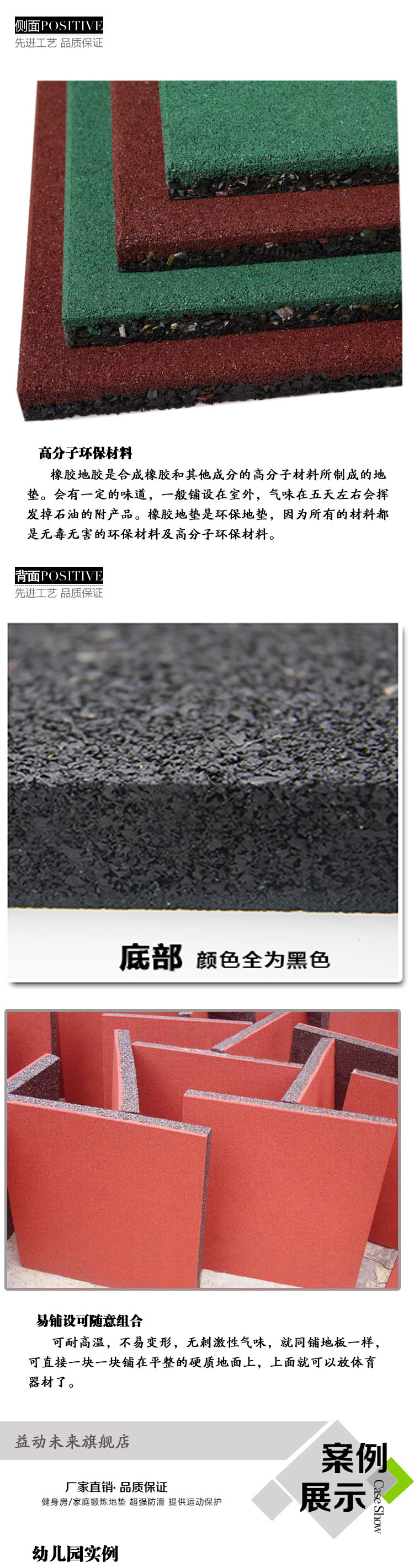 2、橡膠地墊有很好的彈性,人踩在地墊上完全沒有地面的壓力,走在上面感到非常的舒適,而且地墊恢復原狀速度快,能夠迅速的消除人們行走時的疲勞,同時當人們在地墊上嬉鬧的時候,也能夠更好的保障人們的身體安全。